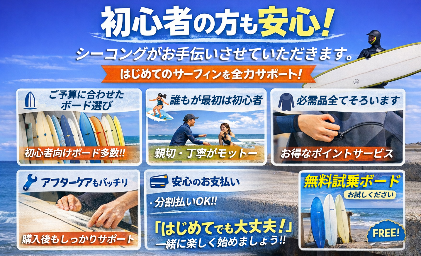 A. もちろん大丈夫です。初心者向けのロングボード選びから、必要な道具、始め方まで丁寧にサポートします。