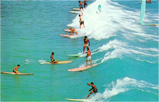 当時は、今のロングボードと同じくらいの長さのボードしかなく、サーファーたちはゆったりと波に乗りながら自由なサーフィンを楽しんでいました。